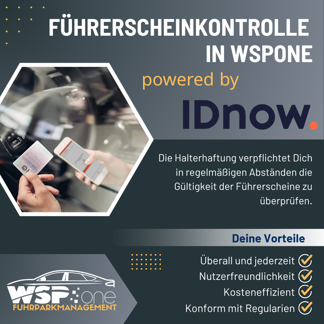 Mit WSPone powered by IDNow wird die Führerscheinkontrolle digital, sicher und einfach umsetzbar und besonders attraktiv. Anders als bei vielen anderen Anbietern zahlen Sie nicht monatlich pro Fahrer, sondern nur dann, wenn tatsächlich eine Überprüfung durchgeführt wird. Diese flexible Struktur reduziert laufende Kosten und schafft Transparenz. Ideal für Fuhrparks mit wechselnden Nutzern oder Poolfahrzeugen.